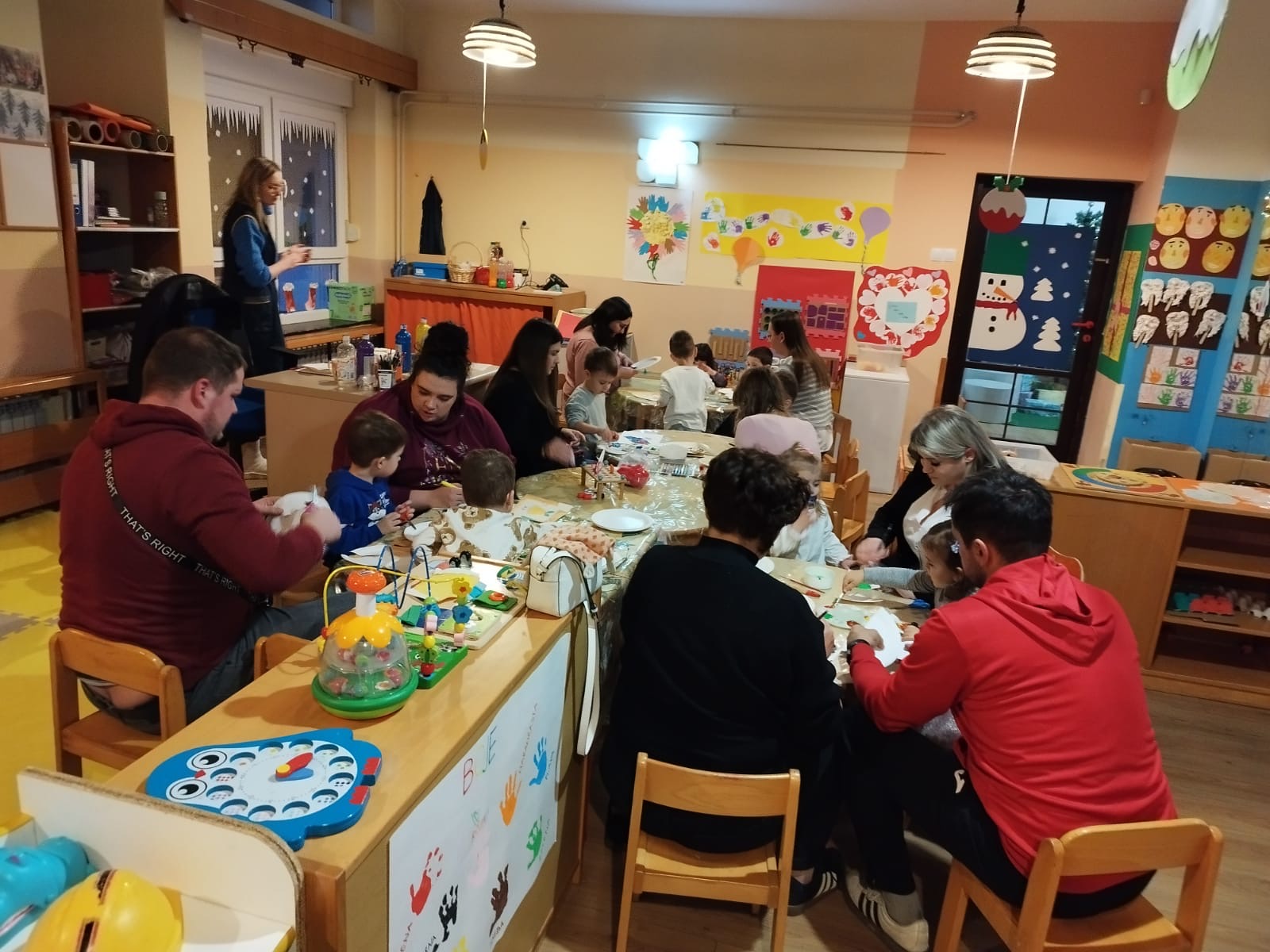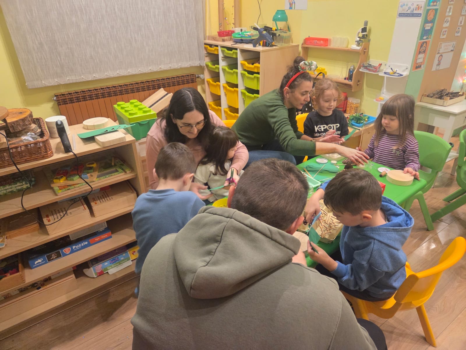 nasmijanih i zadovoljnih lica djece koja se druže sa svojim roditeljima izrađujući