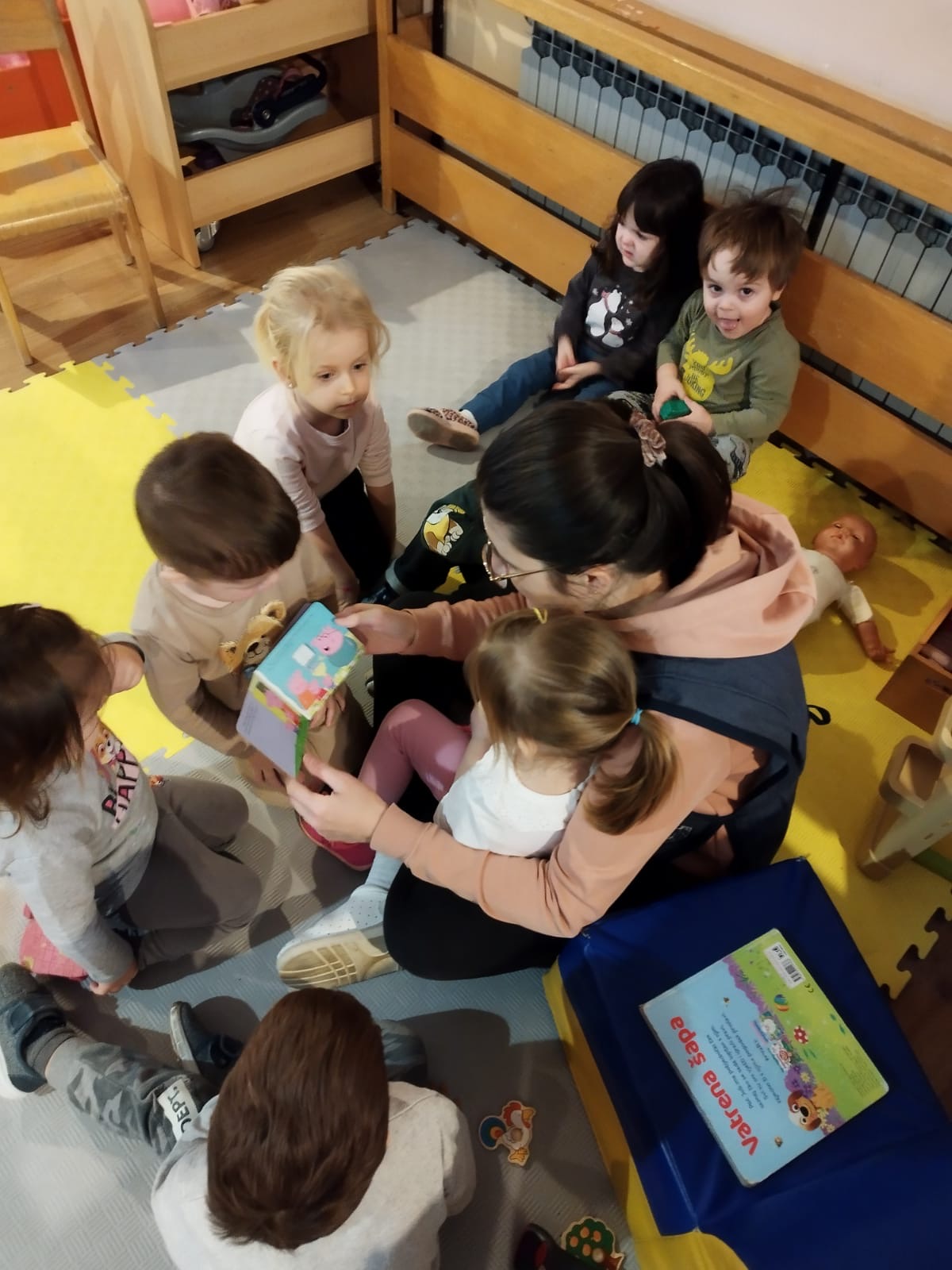 Jaslička skupina čitala je slikovnicu „Peppa Pig: Igra kišnog dana“. Odgojiteljica je okupila djecu na tepihu kako bi bolje vidjeli i pratili doživljaje omiljenog lika Peppa Pig. Zajedno su otkrivali skrivene likove na stranicama slikovnice, a s nestrpljenjem su čekali priliku da je sami prelistaju.