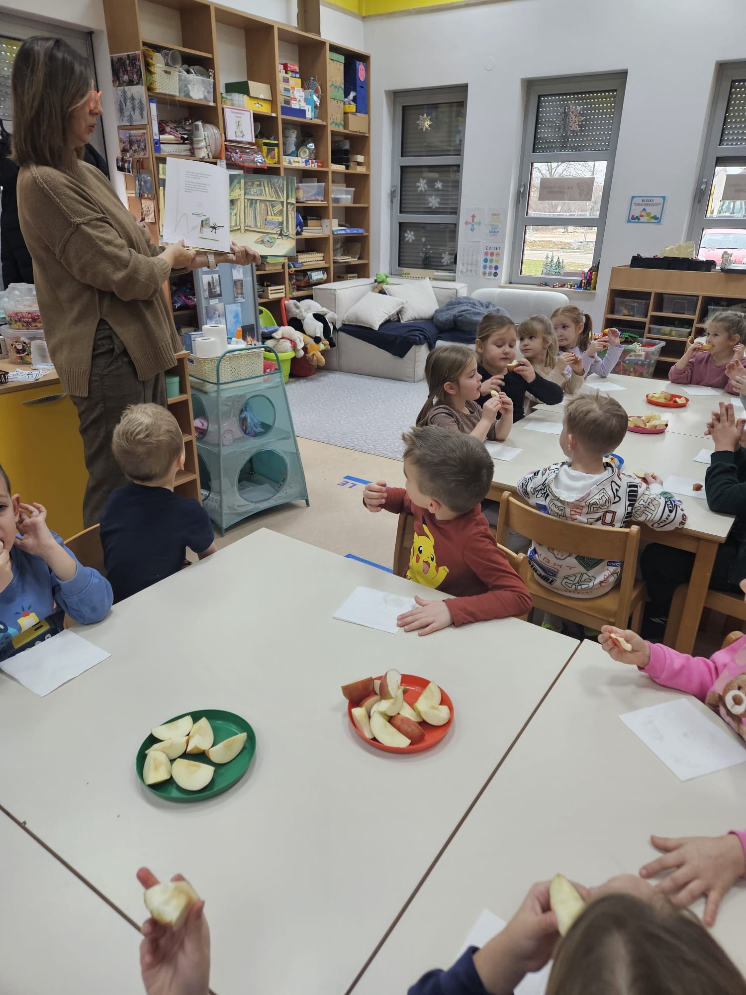 Skupina Smiley je obogatila užinu slikovnicom „Vuk koji je ispao iz knjige“. Dok su uživali u istoj, pažljivo su slušali priču i dogodovštine likova. Pritom su naučili razne nove riječi poput: prapovijest, batler i obrazovanje.